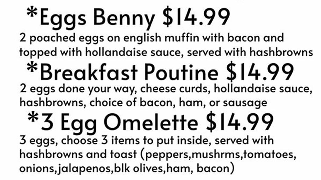 Add: cheddar or mozza $3, sauteed mushrooms or jalapenos $2.50 each