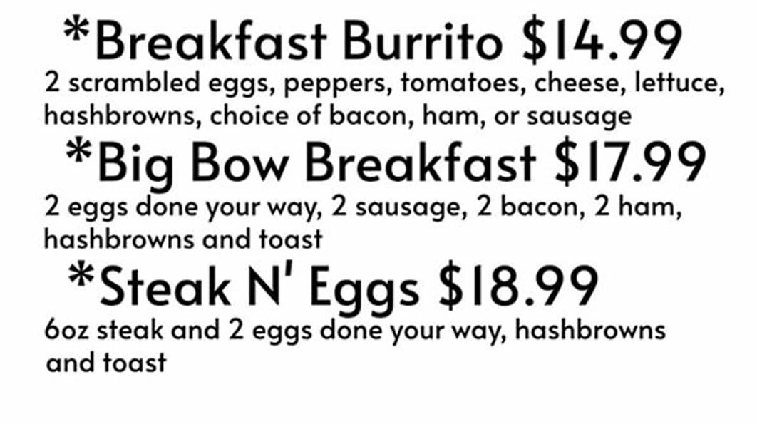 2 Eggs any style and choose: 4 strips of bacon, or 3 sausage links, or ham…